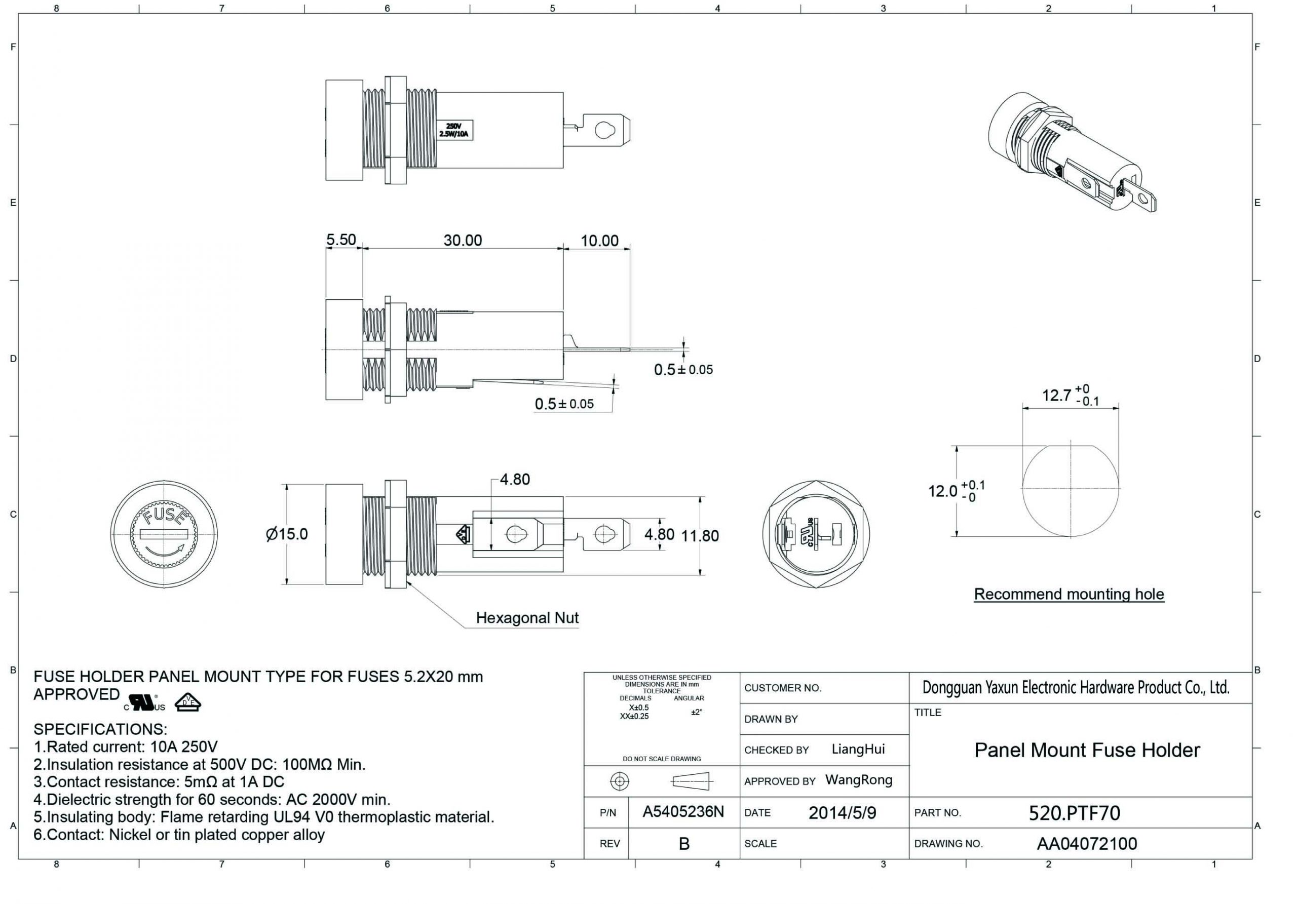 | High Light: | PTF-70 10A, 250V Panel Mount Glass Fuse Holder | ||