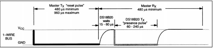 All single-bus devices require strict signal timing to ensure data integrity. DS18B20 has 6 signal types: reset pulse, response pulse, write 0, write 1, read 0 and read 1. All these signals, except the response pulse, are synchronous signals sent by the host. And all commands and data are sent with the low bit of the byte first.